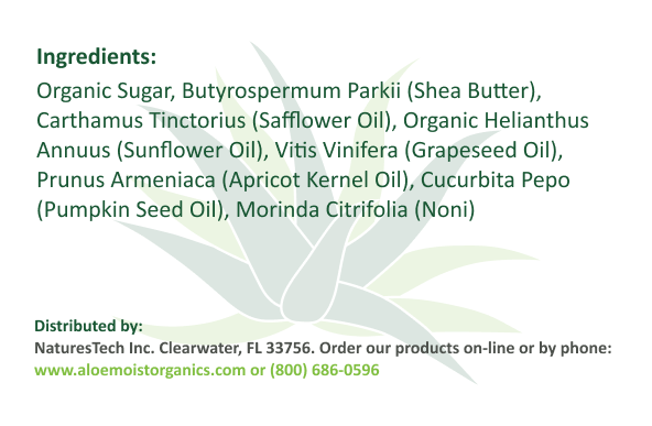 Azúcar orgánico, Butyrospermum Parkii (manteca de karité), Carthamus Tinctorius (aceite de cártamo), Helianthus Annuus orgánico (aceite de girasol), Vitis Vinifera (aceite de semilla de uva), Prunus Armeniaca (aceite de semilla de albaricoque), Cucurbita Pepo (aceite de semilla de calabaza), Morinda Citrifolia (Noni).
