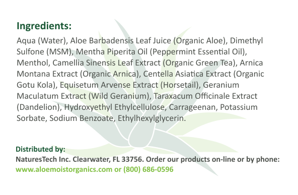 Aqua (Water), Aloe Barbadensis Leaf Juice (Organic Aloe), Dimethyl Sulfone (MSM), Mentha Piperita Oil (Peppermint Essential Oil), Menthol, Camellia Sinensis Leaf Extract (Organic Green Tea), Arnica Montana Extract (Organic Arnica), Centella Asiatica Extract (Organic Gotu Kola), Equisetum Arvense Extract (Horsetail), Geranium Maculatum Extract (Wild Geranium), Taraxacum Officinale Extract (Dandelion), Hydroxyethyl Ethylcellulose, Carrageenan, Potassium Sorbate, Sodium Benzoate, Ethylhexylglycerin.